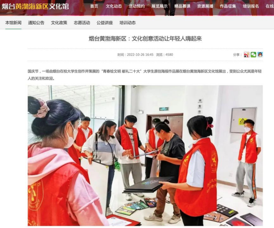 在黄渤海新区文化馆举办的“青春绘文明 献礼二十大——烟台大学生原创海报作品展”中,师生共同策展、布展、