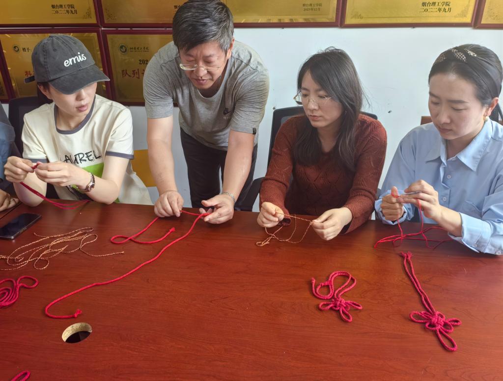 学院邀请了烟台市传统结饰技艺非遗传承人杨光老师,杨老师介绍了中国结的起源、发展以及它所蕴含的深厚文化底蕴,从古代的绳结记事到如今成为象征吉祥、团圆的传统手工艺品,每一个结都承载着中华民族对美好生活的追求与向往。随后,在传承人的悉心指导下,师生们开始了中国结的编织之旅。五彩缤纷的丝线在同学们的指尖舞动,或缠绕或穿插,虽然起初大家手法生疏,但在传承人耐心地纠正和鼓励下,逐渐掌握了基本的编织技巧。