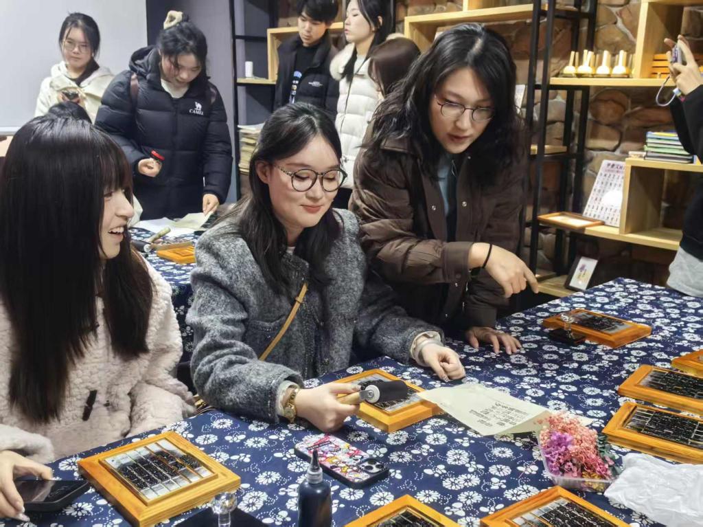 在建2406-2班的行程中,潘萌老师带领学生们首站抵达和万家社区。一场爱国主题电影放映,瞬间拉近了学生与社区的情感距离,家国情怀如细雨般浸润心田。随后的行程更是一场穿越时空的文化对话。在乡愁体验馆,学生们亲手体验活字印刷、古法造纸。墨香四溢间,指尖触摸的不只是凹凸的文字,更是千年文明的血脉传承。而当他们走进和美书院,面对精巧的非遗手工作品时,未来的数字媒体艺术家们陷入了沉思——如何用现代数字技术,让这些濒临失传的技艺重焕生机?文化自信的种子,在此刻悄然播下。