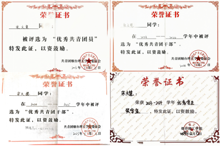 作为一名学生干部,她始终以服务同学,锻炼自我为宗旨,积极参加学校组织的各类活动,荣获优秀团干部、优秀共青团员等荣誉称号。她充分发挥学生党员模范带头作用,积极参与志愿公益活动,荣获烟台市优秀志愿者称号,以实践转化所学,扛起青年担当,凝聚青春合力。