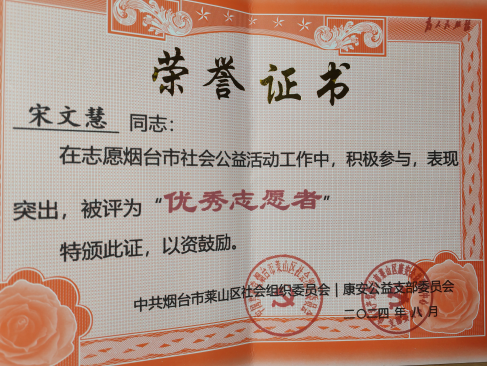 5.2024年中共烟台市莱山区社会组织委员会优秀志愿者;