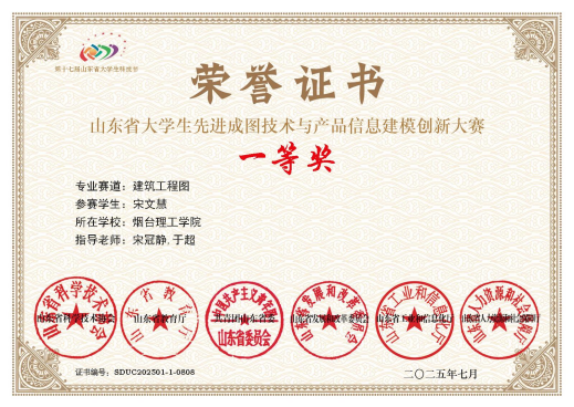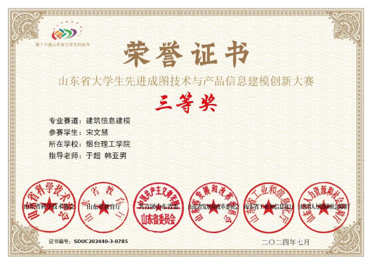 “行远自迩,笃行不怠”,在学习上,她始终秉持着“学而不思则罔,思而不学则殆”的理念,不仅在课堂上认真听讲,课后也积极进行知识的巩固与拓展,同时为自己制定合理的学习计划,最终取得综合测评成绩专业第一,智育成绩专业第二,曾多次获得优秀学生奖学金,学习优秀二等奖学金等。此外,她还积极参与学科竞赛,曾获七项省级奖项,连续两年荣获山东省先进成图技术与产品信息建模创新大赛BIM创新应用大赛一等奖。