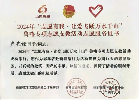 她始终坚信“实践出真知,服务显担当”,主动将个人成长融入社会服务之中。不仅积极参与校内“学风建设”志愿服务,更走出校园,先后赴新疆、广西偏远地区参与支教志愿服务。在支教过程中,面对当地教学资源有限的现状,精心设计“趣味课堂”等教学内容。在服务他人、奉献社会的实践中,她的沟通协调、组织统筹与应急处理能力得到全面锤炼,更深刻体会到青年担当的时代内涵,让青春在实践奉献中绽放光彩。