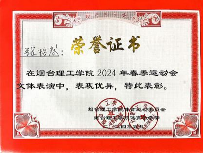 8.2024年获的烟台理工学院春季运动会文体表演荣誉证书。
