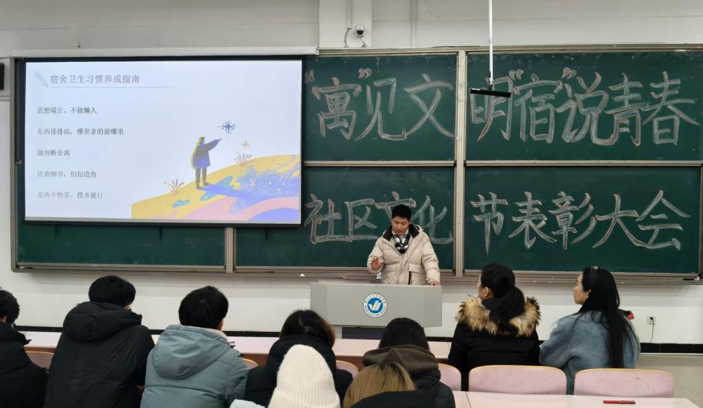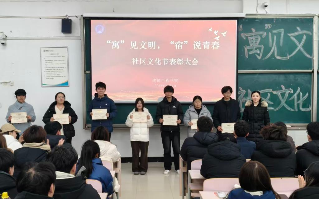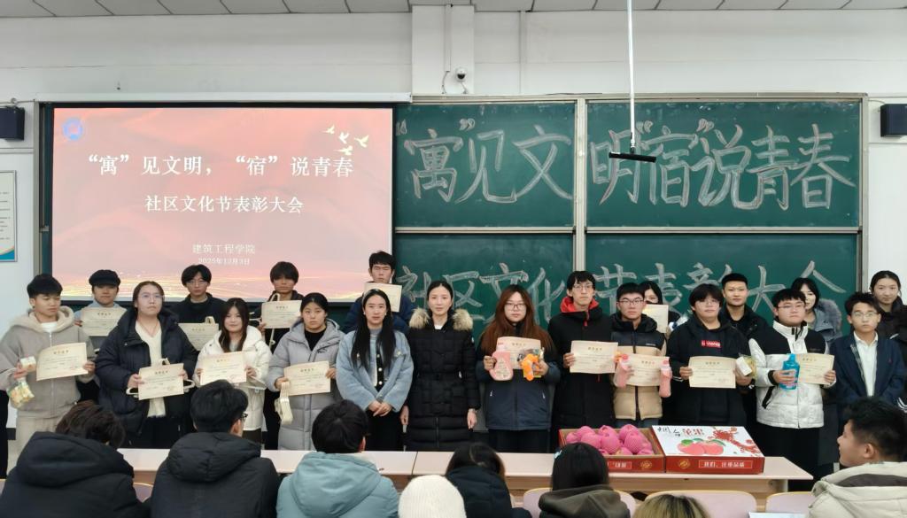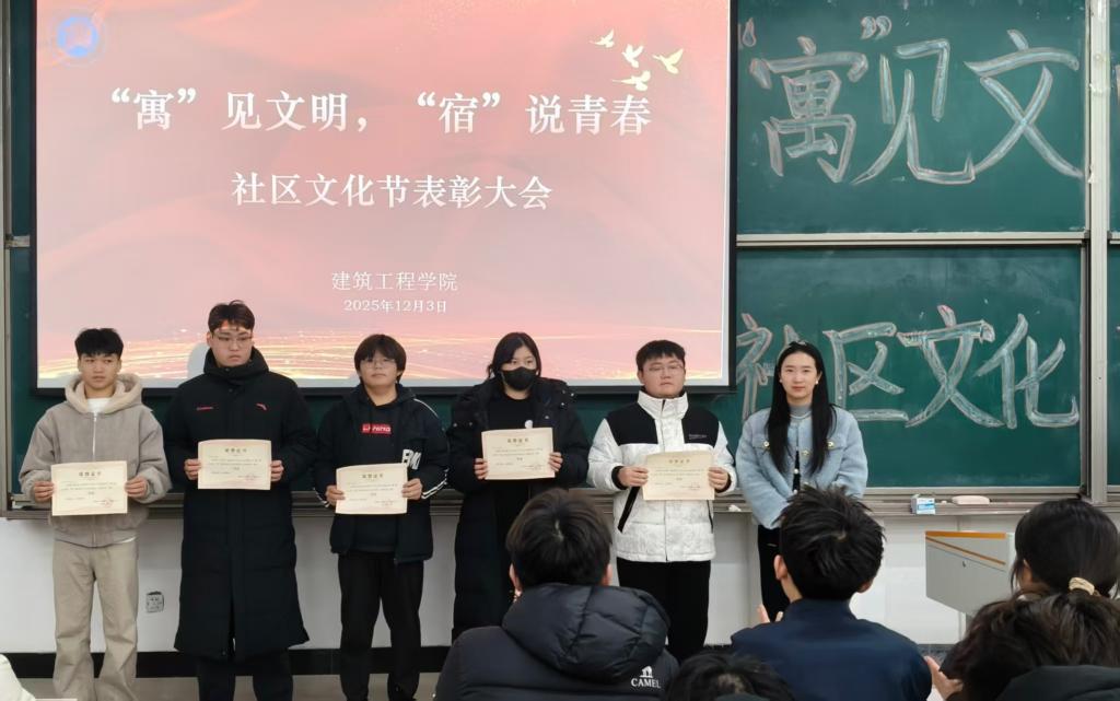 为深入践行“为同学办实事”理念,将人文关怀精准落到实处,12月3日,建筑工程学院“寓”见文明,“宿”说青春社区文化节表彰大会圆满落幕。活动以宿舍文化建设为纽带,聚焦同学们的实际需求,通过物资帮扶、经验分享、情感关怀等具体举措,让方寸天地成为传递温暖、凝聚情谊的育人港湾,切实把学院的关爱送到每一位学子心中。建筑工程学院团总支副书记孙中惠、辅导员葛晓菲参与本次活动。