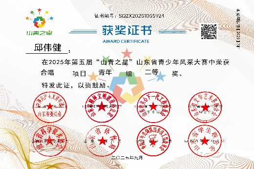13.2025年9月获第五届“山青之星”山东省青少年风采大赛中荣获合唱项目青年组二等奖;