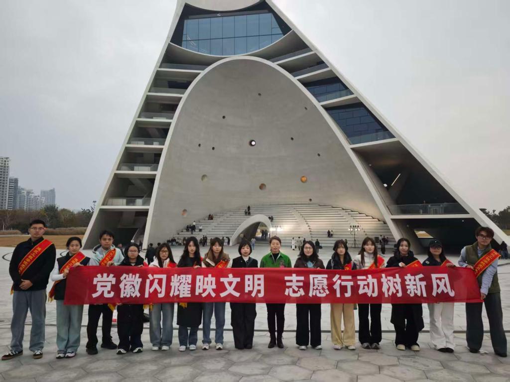 为了建设文明实践新风,贯彻落实“双报到”工作要求,树立党员模范形象,2025年11月8日建筑工程学院的党员志愿者队伍已以“党徽闪耀映文明 志愿行动树新风”为帜,在这座现代建筑载体下,铺展一场嵌合数字媒体艺术专业特质的志愿实践。