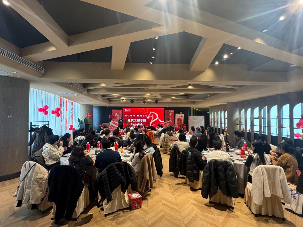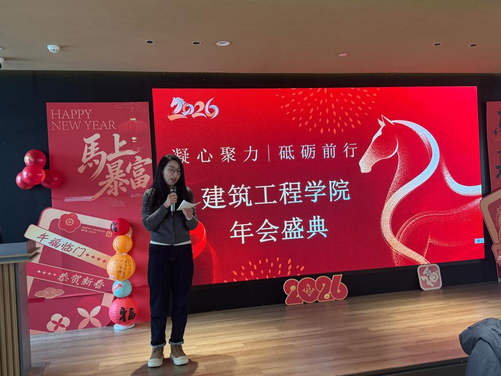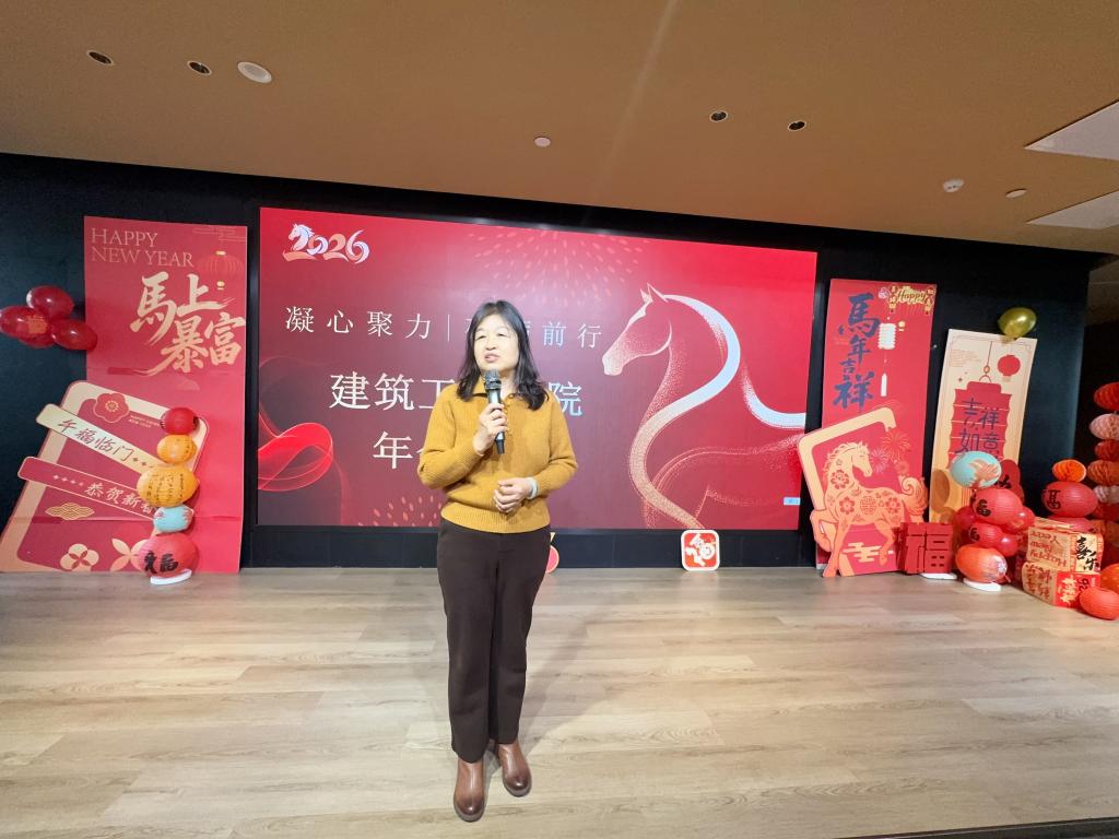 辞旧迎新,奋启新程,1月26日,建筑工程学院2026年年会隆重举行,烟台理工学院纪委书记、副校长张中华,建筑工程学院院长辛翠香,建筑工程学院学术院长曲淑英,建筑工程学院常务副院长田娜,建筑学专业负责人贾志林,数字媒体艺术专业负责人曲晓莉,建筑工程学院党总支副书记臧延云,建筑工程学院院长助理隋黎莉,建筑工程学院团总支副书记孙中惠,建筑工程学院组织员于渊以及全院教职工共聚一堂,共启新程。年会以“凝心聚力,砥砺前行”为主题,通过年会小游戏、抽奖与文艺表演等环节,铺陈学院发展新画卷,奏响奋进建工新篇章。